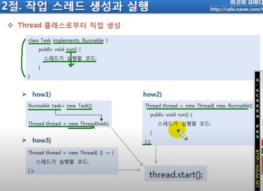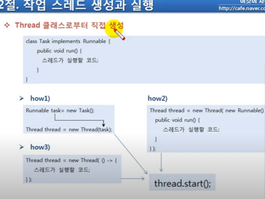 작업 스레드 클래스로부터 작업 스레드 객체를 생성하는 방법은 일반적인 객체를 생허나는 방법과 동일하다.