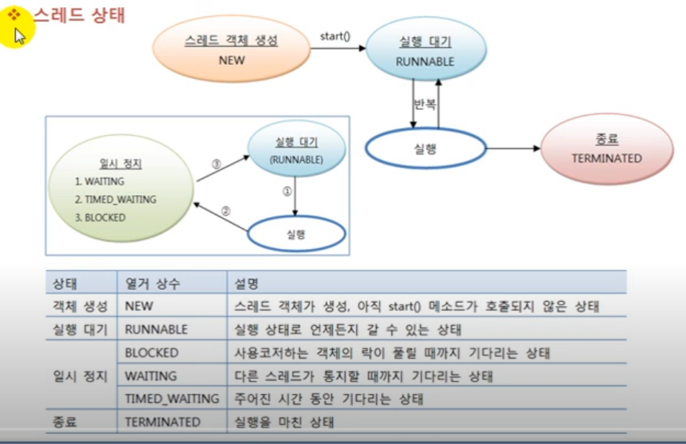 스레드가 다시 실행 상태로 가기 위해서는 일시 정지 상태에서 실행 대기 상태로 가야 한다는 것만 알아 두자