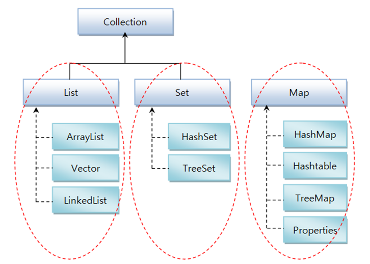 컬렉션 프레임워크의 주요 인터페이스로는 List, Set, Map이 있다. 이 인터페이스들은 컬렉션을 사용하는 방법을 정의한 것인데, 다음은 이 인터페이스로 사용가능한 컬렉션 클랙스들을 보여준다.