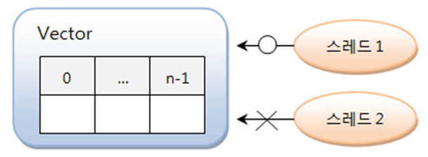 ArrayList와 다른 점은 Vector는 동기화된(synchronized) 메소드로 구성되어 있기 때문에 멀티 스레드가 동시에 이 메소드들을 실행할 수 없고,