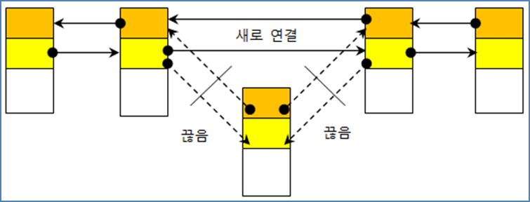 다음은 중간에 객체를 제거할 경우 앞뒤 링크의 수정이 일어나는 모습을 보여주고 있다.