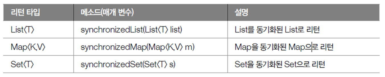 매개값으로 비동기화된 컬렉션을 대입하면 동기화된 컬렉션을 리턴한다.