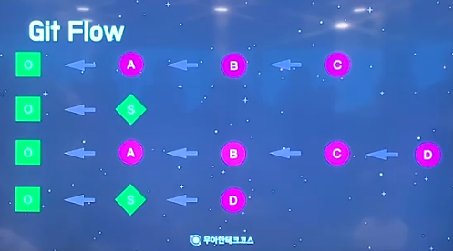 -> 하나의 흐름으로 생성되지만, 원래 있던 커밋이 뒤에가서 붙는다.