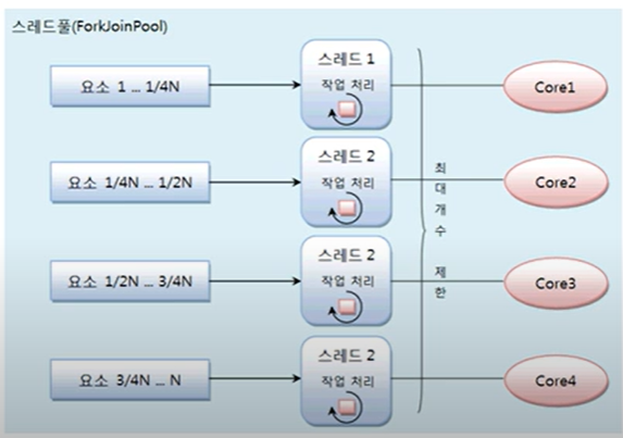 내부적으로 전체요소를 서브 요소들로 나누고, 요소들을 개별 스레드가 처리한다.