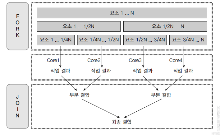 멀티 코어의 수만큼 대용량 요소를 서브 요소들로 나누고, 각각의 서브 요소들을 분리된 스레드에서 병렬 처리시킨다.