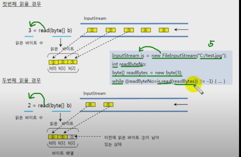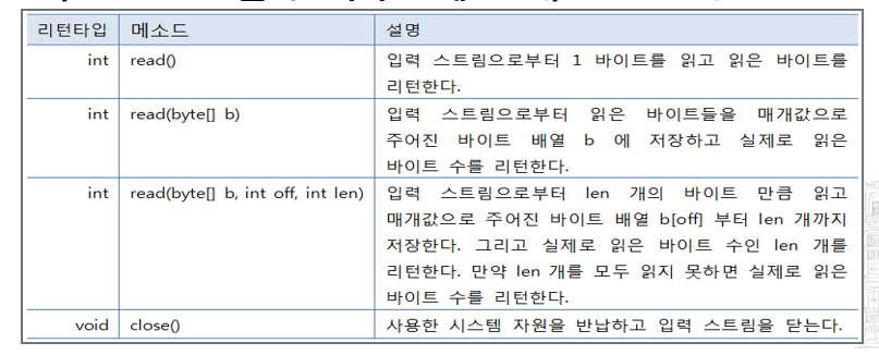 read(byte[] b , int off, int len ) 역시 입력 스트림으로부터 바이트를 더이상 읽을수 없다면 -1을 리턶나다