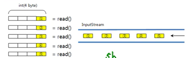따라서 리턴된 4바이트 중 끝의 1바이트에만 데이터가 들어 있다, 예를 들어 입력 스트림에서 5개의 바이트가 들어 온다면 다음과 같이 read()메소드로 1바이트씩 5번 읽을 수 있다.