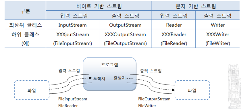 스트림 클래스는 크게 두종류로 구분 된다. 하나는 바이트(byte) 기반 스트림이고, 다른 하나는 문자(charter) 기반 스트림이다