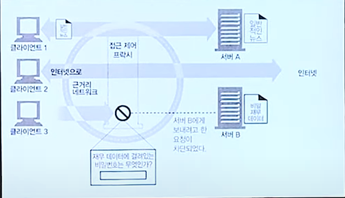 서버와 클라이언트 사이에 중계기로서 클라이언트 대신 서버와 댈리로 통신을 수행하는 서버