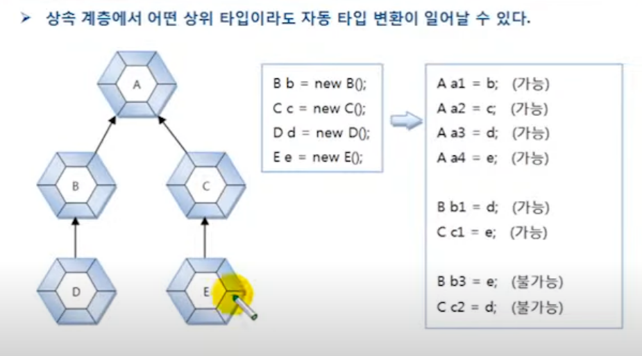 바로 위의 부모가 아니더라도 상속 계층에서 상위 타입 이라면 자동 타입 변환이 일어날 수있다.