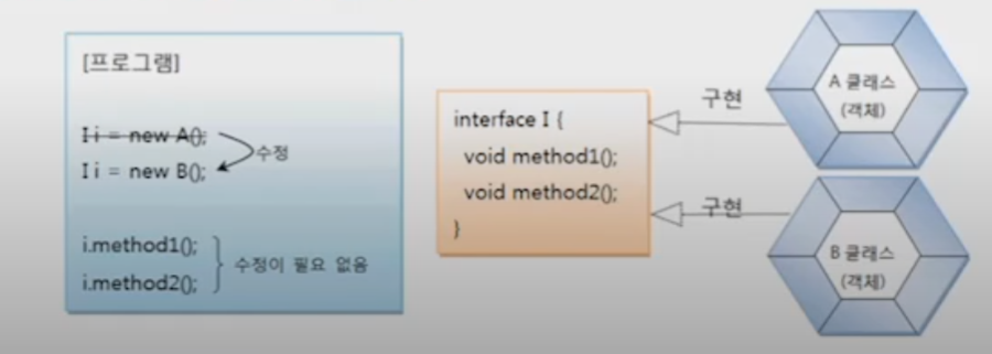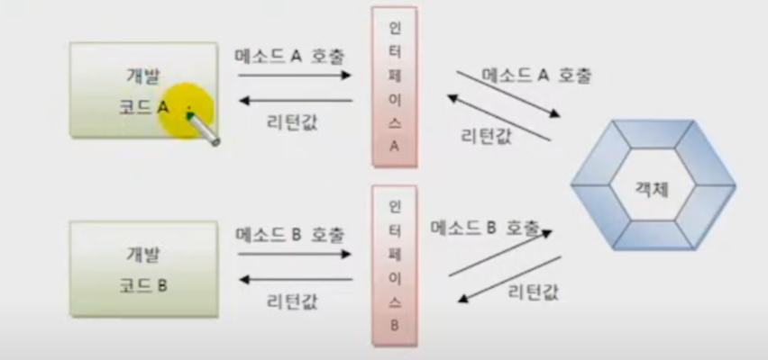 개발 코드가 인터페이스의 메소드를 호출 -> 인터페이스는 객체 메소드 호출
