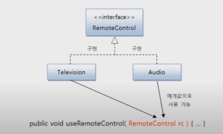 메소드 호출 시 매개값으로 여러가지 종류 구현 객체를 줄수 있기 때문