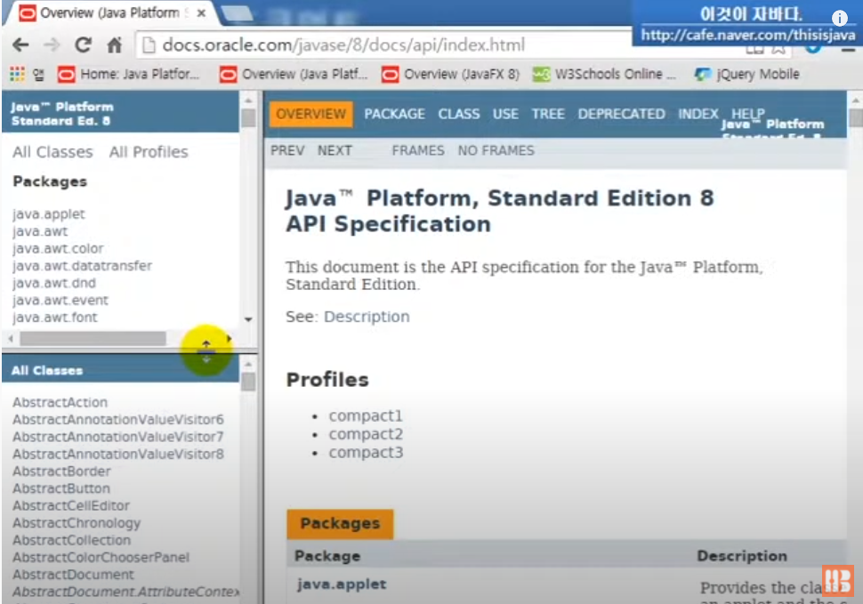 API 도큐먼트는 세개의 프레임으로 나뉘어져 있다