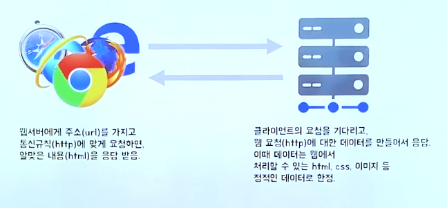Web 인터넷을 기반으로 한, 정보를 공유, 검색할 수 있게 하는 서비스 URL(주소), HTTP(통신 규칙), HTML(내용) Server 클라이언트에게 네트워크 통해 정보나 서비스를 제공하는 컴퓨터 시스템 Web Server 인테넛을 기반으로 클라이언트에게 웹 서비스를 제공하는 컴퓨터 APACHE MICROSOFT LLS Web Application Server Web Application 웹에서 실행되는 응용프로그램 Web Application Server 웹 애플리케이션과 서버 환경을 만들어 동작 시키는 기능을 제공하는 소프트웨어 프레임워크 웹 애플리케이션을 실행시켜 필요한 기능을 수행하고 그 결과를 웹 서버에게 전달 1. php, jsp, asp 를 사용해 동적인 페이지를 생성할수 있는 서버 2..