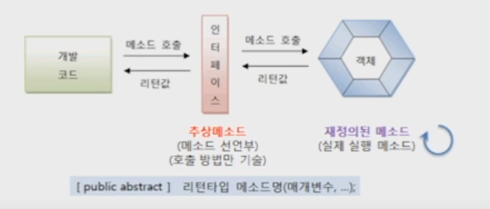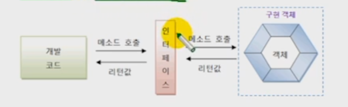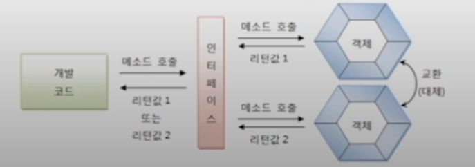 개발 코드가 인터페이스의 메소드를 호출 -> 인터페이스는 객체 메소드 호출